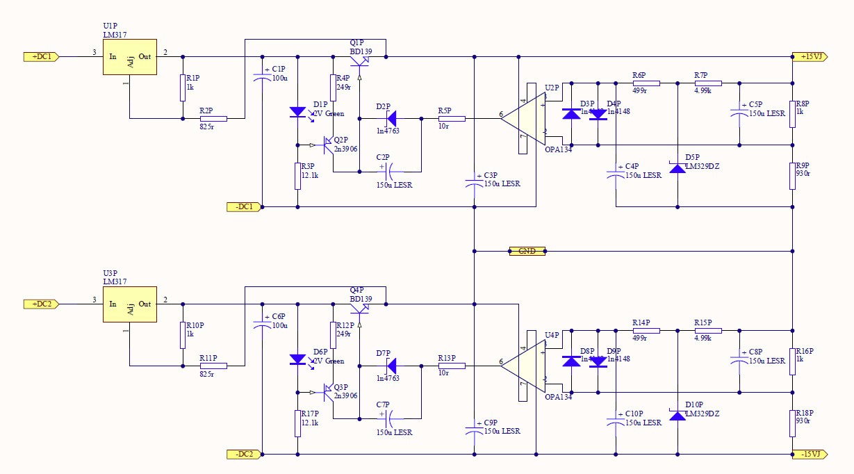 Ladusin kokku antud pildi järgi regulaatori. Aga +/-15 voldi asemel saan -7,2 /+7,8. Sisse lasen toitekast 23v + 23v.