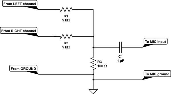 Arvuti helikaardi liinisisendi taga toimib kenasti. Kuid tekkis probleem selle värgi sobitamisel tahvelarvutiga. Tahan karaokemikserist signaali anda tahvli mikrisisendisse. On olemas TRRS jagaja, mis selle pesa eraldi 3,5 mm pesadeks jagab, suvaline elektreetmikker töötab sellega. Tekitasin vahekaabli sellise skeemi järgi (konde panin veidi suurema, polnud skeemil näidatud väärtusega isendit):