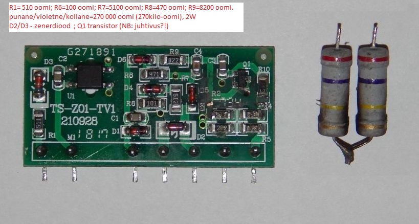 See Q on transistor ja kui sellel on kood loetav siis selle koodi järgi on võimalik leida sinna sobiv detail. Suvalist sinna panna ei tohi. Ülejäänud R markeeringuga asjade lugemine käib nii, et 2 esimest numbrit, näiteks 822 puhul "82" ja siis 3. number tähendab seal NULLIDE arvu, et siis antudjuhul "2"-nulli peale "82"=8200 ehk 8200 oomi ehk 8,2kilo-oomi.