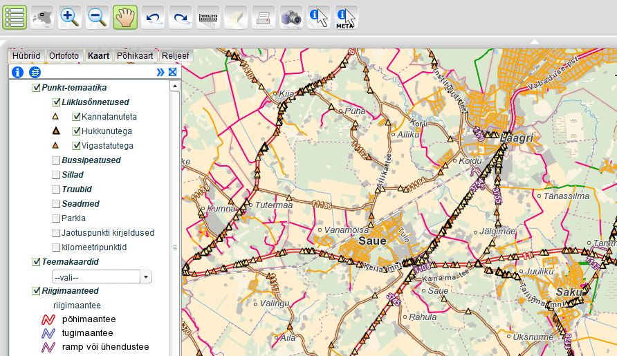 Info nupp valida ja kaardi peal kolmnurkade peal klikata näitab kuupäeva, õnnetuse tüüpi jms infot.